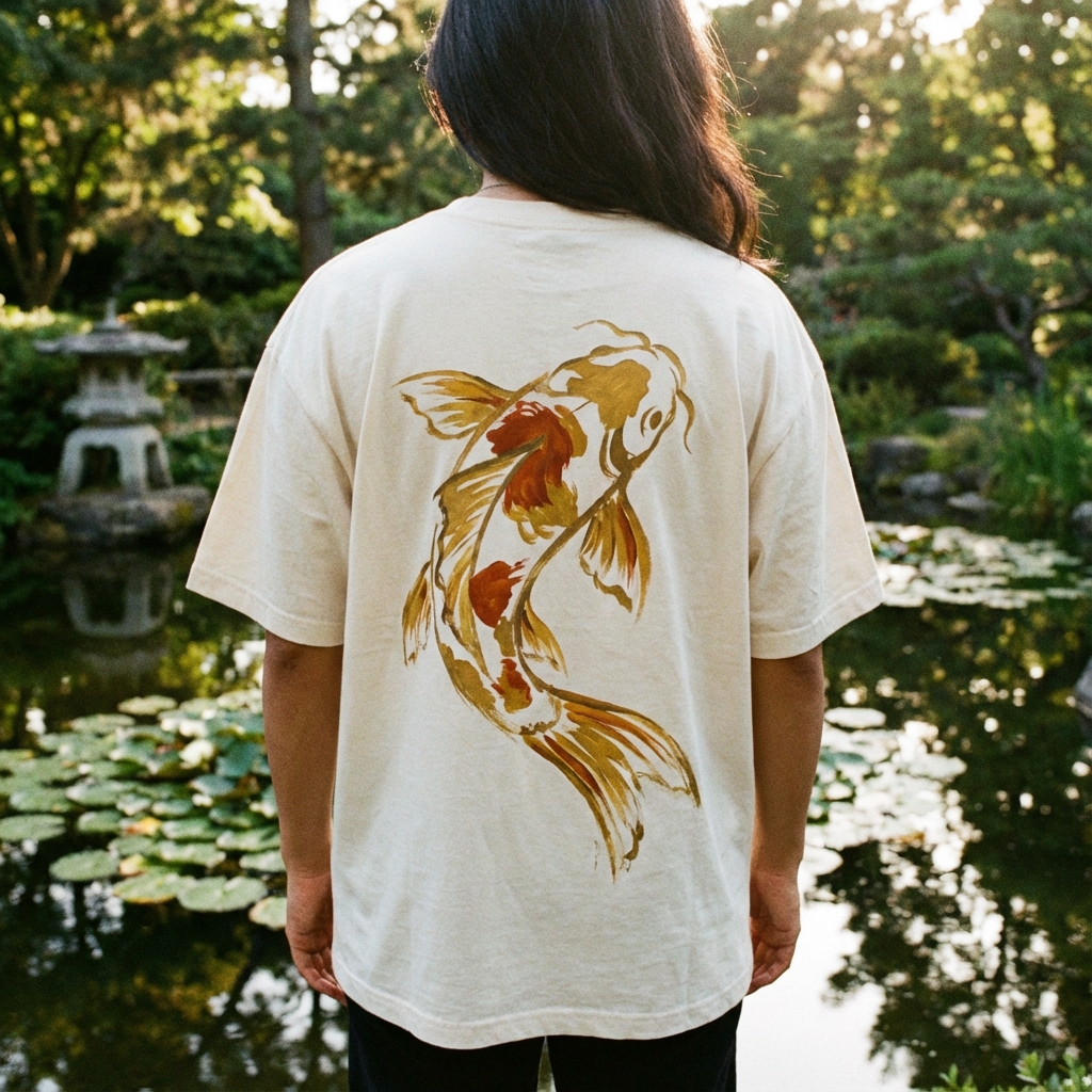 Serenity in motion. This cream tee features a magnificent golden-orange brushstroke Koi fish on the back, symbolizing peace and perseverance.