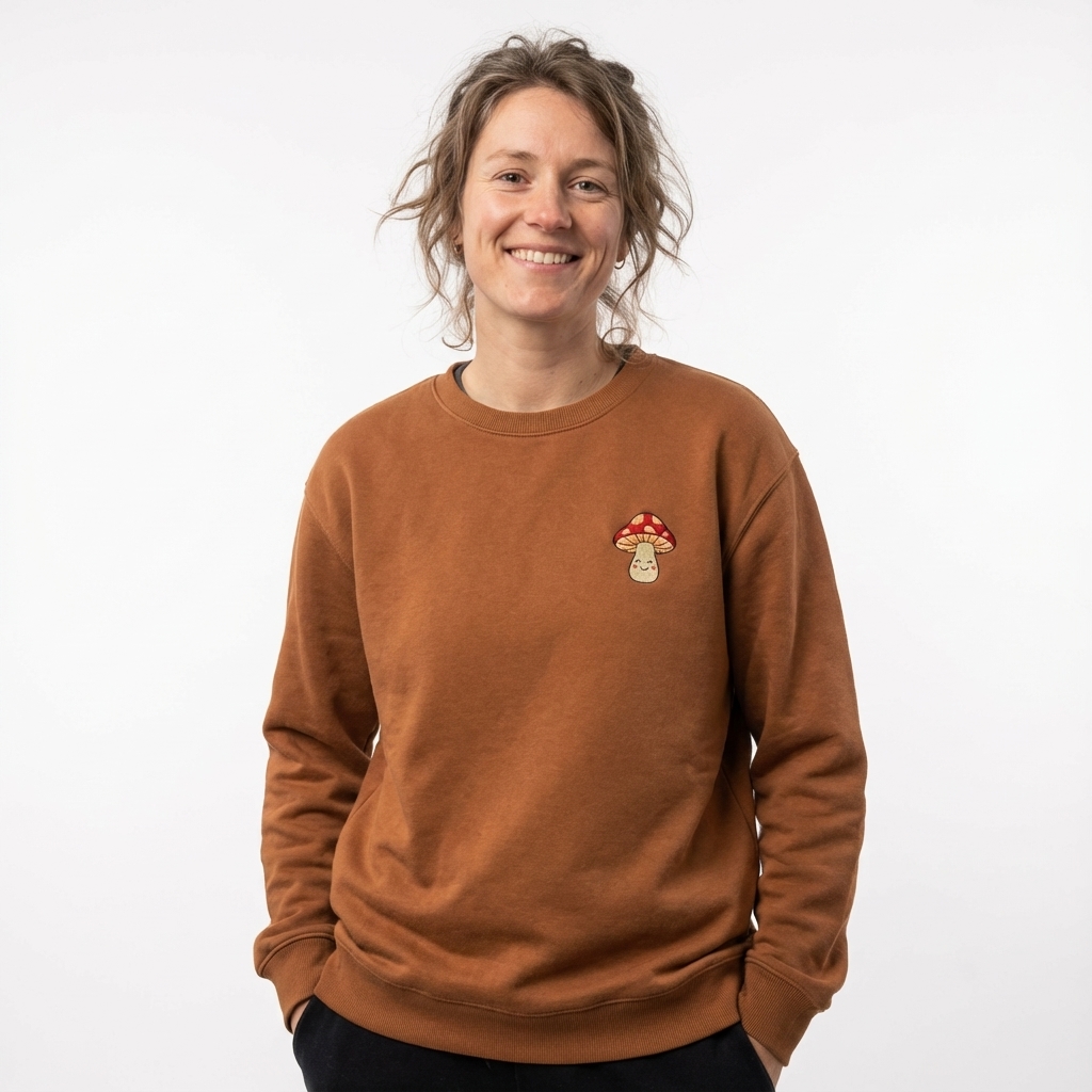 Fun and grounded. This earth brown crewneck features charming mushroom details for a nature-inspired look.